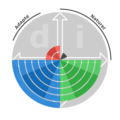 Les quatre composantes du DISCp4 sont représentées sur un disque simple à appréhender. Pour une analyse plus détaillée, notamment dans le cadre d'une équipe, il est utile de raffiner ces résultats. Ainsi, les huit tendances du DISCp4 - Conducteur, Motivateur, Promoteur, Facilitateur, Supporteur, Coordinateur, Évaluateur, Organisateur - offrent une vision plus précise du profil de Sophie. Sur ce disque (roue des tendances), son profil, marqué par un carré pour le style adapté ou un cercle pour le style naturel, se situe plus ou moins près des bords. Plus ces symboles sont proches des bords du disque, plus Sophie présente de façon prononcée la tendance correspondante.